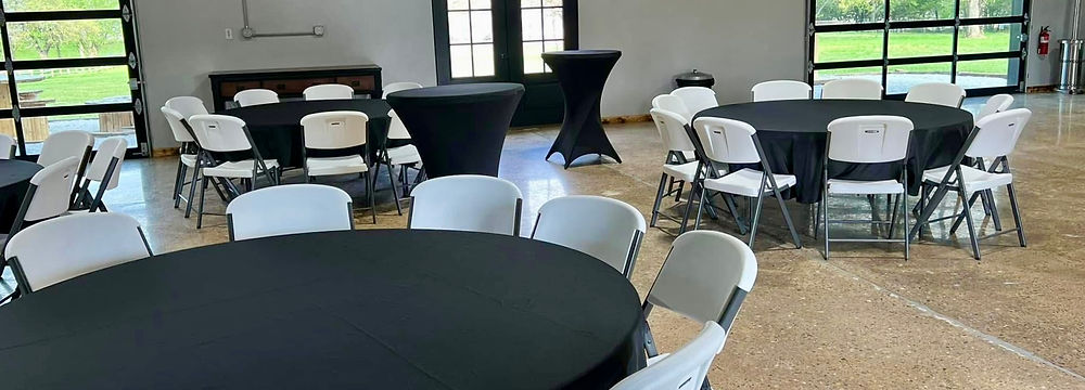 Perfect for showers, meetings, or small gatherings that need a shorter time frame. Available only on weekdays. Rental time is 9:00 AM-11:00 AM with a 30-minute setup beginning at 8:30. You can add on an hour after your rental time for an additional $50, just check that option on the booking page. Includes: Tables & chairs with black linens Buffet table for food & drinks Kitchenette with fridge & prep space